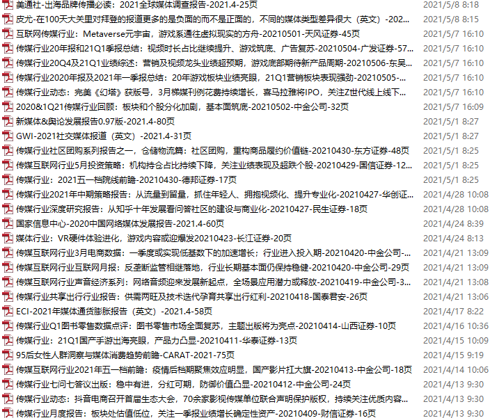 传媒媒体资料包,月度新增29份(2021.4.10-5.8)