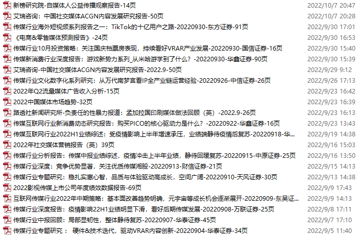 传媒媒体资料包,月度新增22份(2022.9.3-10.8)