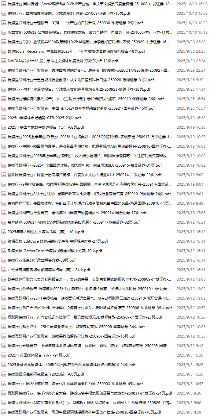 传媒媒体资料包,月度新增44份(2025.8.29-2025.10.10):