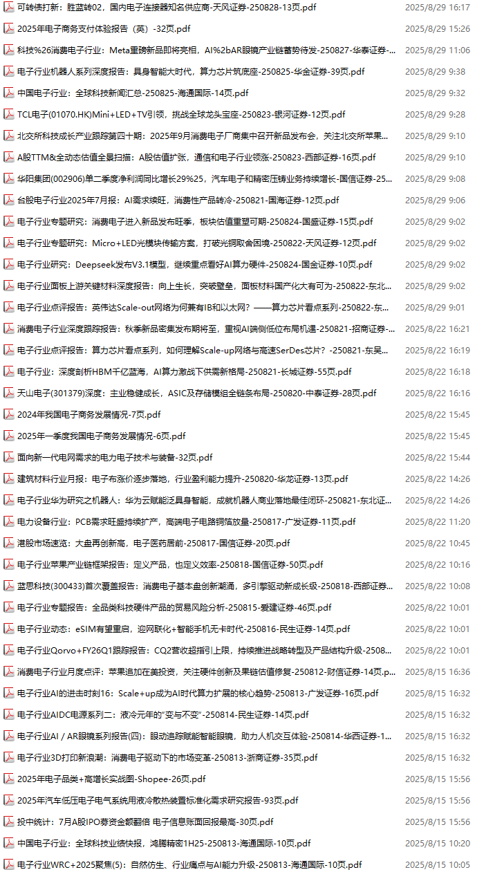 电子行业资料包,月度新增62份(2025.8.1-2025.8.29):
